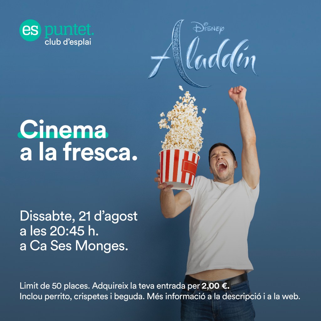 Després de la meravellosa vetllada que vam passar al darrer cinema a la fresca, proposam un segon cinema a la fresca amb la projecció de la pel·lícula “Aladdin: live action”. Aquesta activitat no és únicament pels infants des Puntet, sinó que està oberta a tothom que vulgui venir!