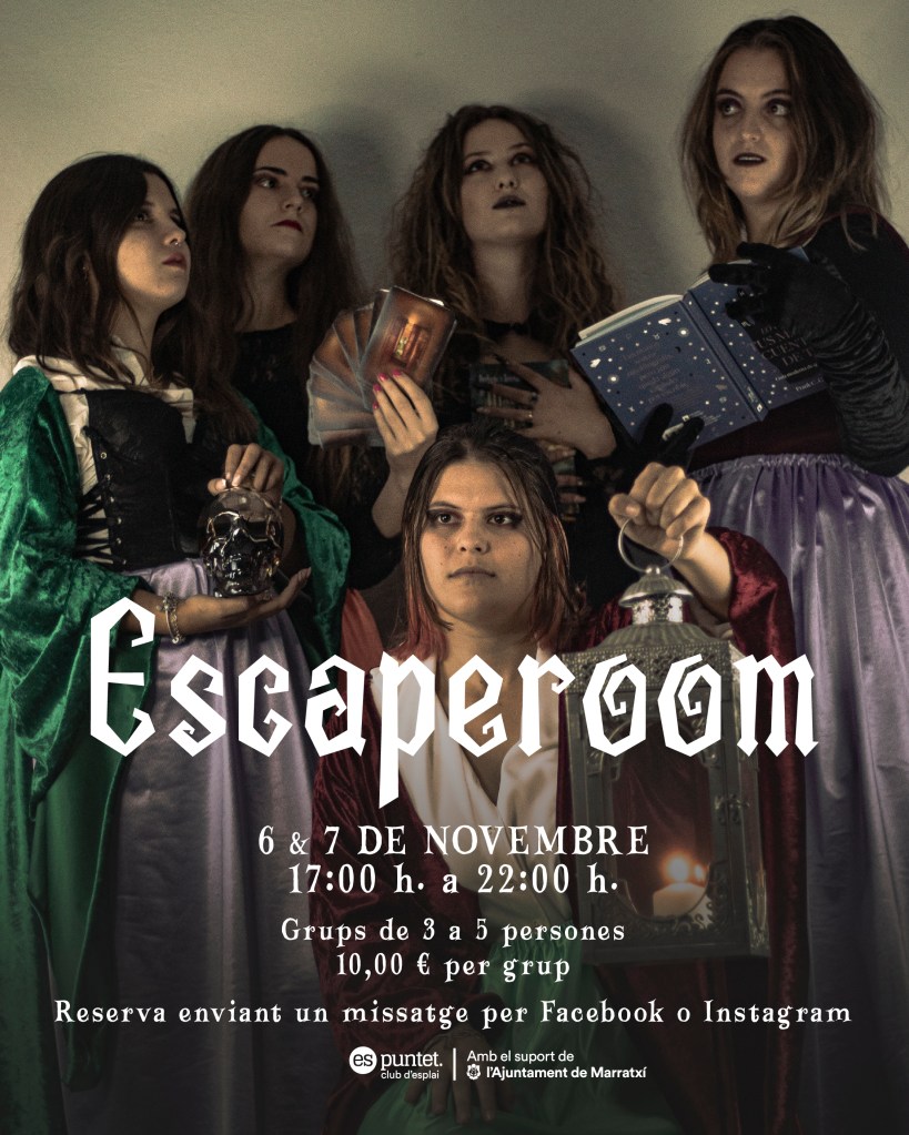 L’escaperoom tendrà lloc els dies 6 i 7 de novembre de 17:00h a 22:00h. Seran necessaris grups de 3 a 5 membres amb un preu de 10,00 € per grup. Les sessions seran de mitja hora i cal fer una reserva prèvia enviant-nos un missatge al nostre facebook, instagram o enviant-nos un correu electrònic al nostre mail espuntet.esplai@gmail.com.