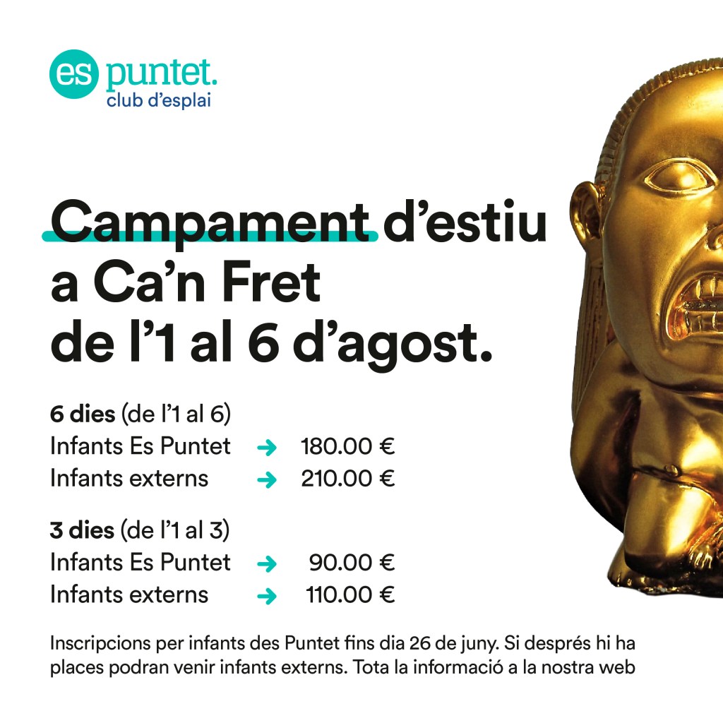 Aquest serà al campament juvenil Can Fret del 1 al 6 d’agost. No obstant això, per aquells infants que no se senten preparats a estar sis dies fora de casa també donam l’opció de venir de dia 1 al 3 d’agost. Podeu reservar la vostra plaça a partir d’avui i fins dia 26 de juny enviant-nos un missatge i dissabte formalitzarem la inscripció.