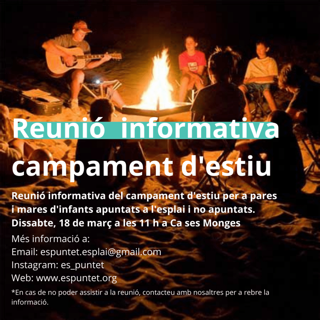 El proper dissabte 18 farem la reunió informativa pel campament d’estiu. Serà a les 11 h a Ca ses Monges. La reunió estarà oberta a tothom, pares d’infants de l’esplai i d’infants externs. Vos esperem!🌀