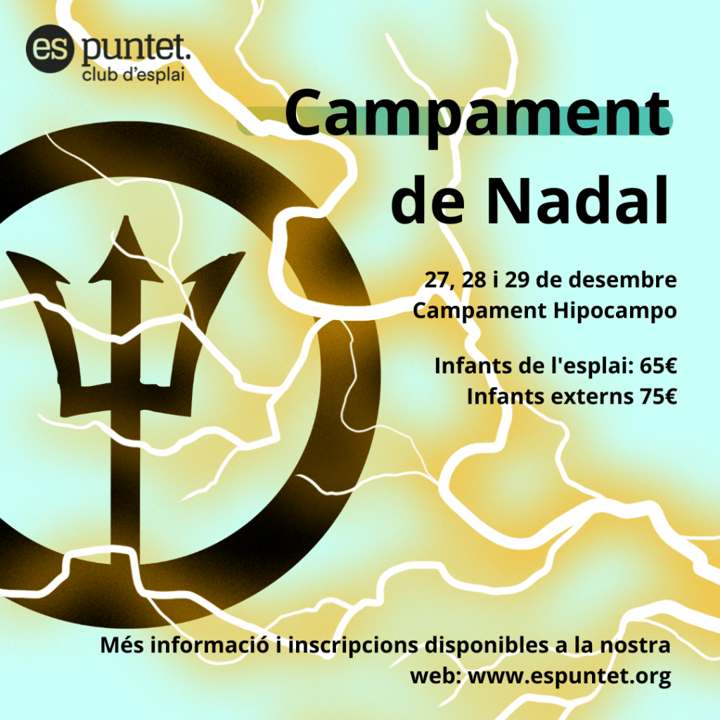 Ara que ja s’acaba el primer trimestre del curs, ens complau anunciar que tenim campament de Nadal! Enguany anirem al Campament Hipocampo els díes 27, 28 i 29 de desembre. El preu del campament serà de 65€ per infants des Puntet i 75€ per infants externs. Les places són molt limitades, per això es faran les inscripcions primer pels infants des Puntet i després pels externs.