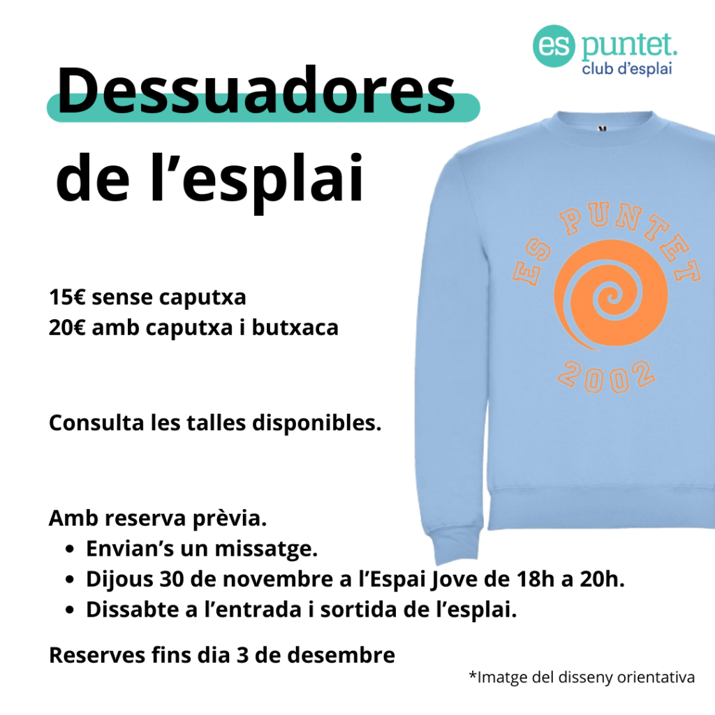 Enguany Es Puntet ha preparat noves dessuadores. Com a novetat, hi ha la possibilitat d’adquirir la dessuadora normal o amb caputxa i butxaca. La normal tendrà un preu de 15€ i la dessuadora amb caputxa i butxaca tendrà un preu de 20€