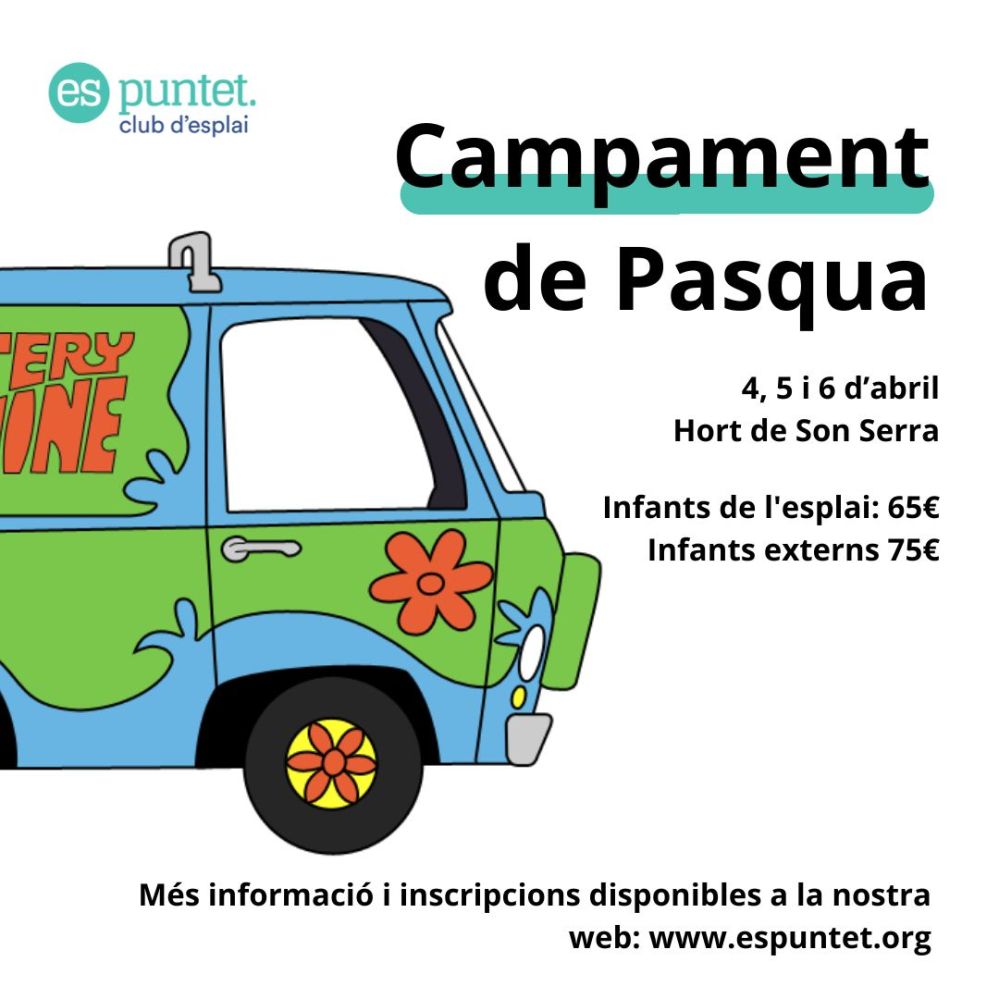 ens complau anunciar que tenim campament de Pasqua! Enguany anirem al Campament d’hort de Son Serra a Son Serra de Marina els dies 4, 5 i 6 d’abril. El preu del campament serà de 65€ per infants des Puntet i 75€ per infants externs. Les places són molt limitades, per això es faran les inscripcions primer pels infants des Puntet i després pels externs.