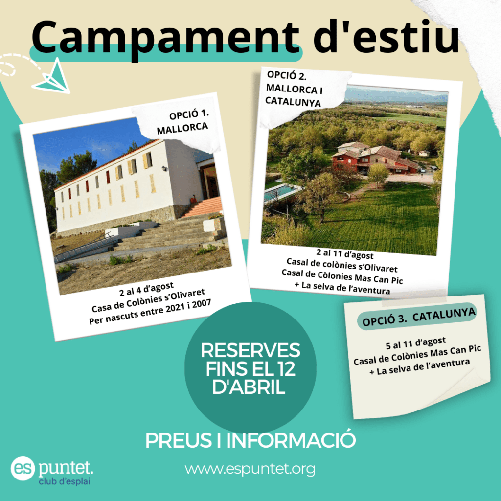 Les places són limitades, així que afanyeu-vos. Tota la informació sobre les dates, els casals, les sortides, equipatge, funcionament del campament i pagaments ho trobareu al document a continuació.